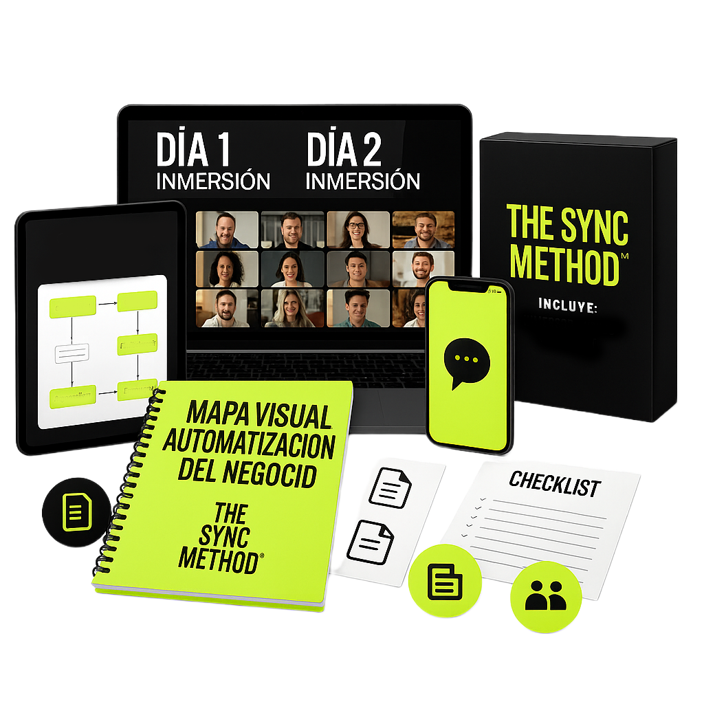 ¡The Sync Method™ me ayudó a transformar mi negocio! Antes, me sentía abrumado con tantas tareas manuales, pero ahora tengo todo automatizado y puedo dedicar más tiempo a mis clientes. - Juan Pérez